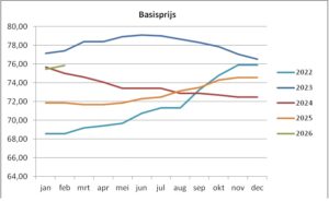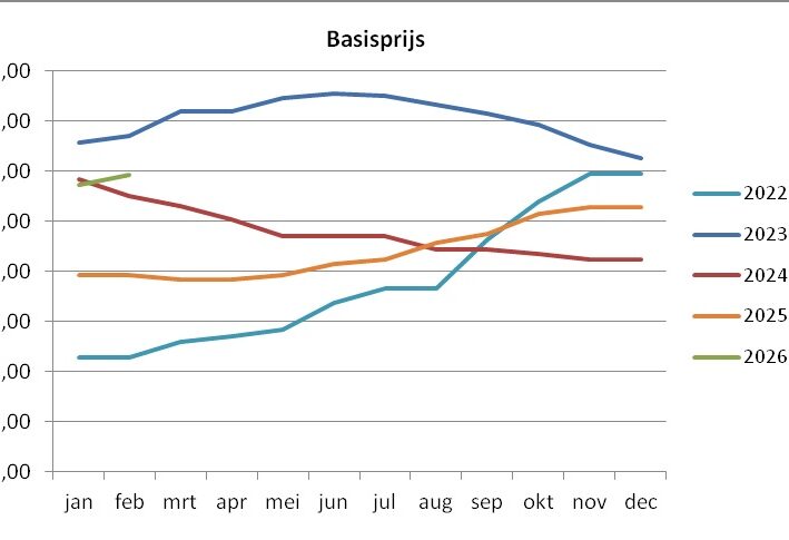 De basisprijs is de prijs bij een vast vet- en eiwitpercentage van 7,50% (4,00% vet en 3,50% eiwit). In januari en februari 2026 is de basisprijs van het nieuwe standaardbedrijf € 75,46 en € 75,84.